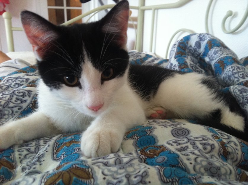 Ung hannkatt (4-6 mnd). Hvit på alle ben, og sort hale. Ellers jevnt fordelt med hvite og sorte områder.Mye hvitt på brystet. Tilgittsfull.