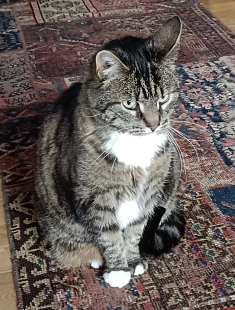 Bella er en 10år gammel hunnkatt, brun makrellstripet med hvite poter, bryst og mage. Hun er i godt hold og litt romslig rundt magen.
