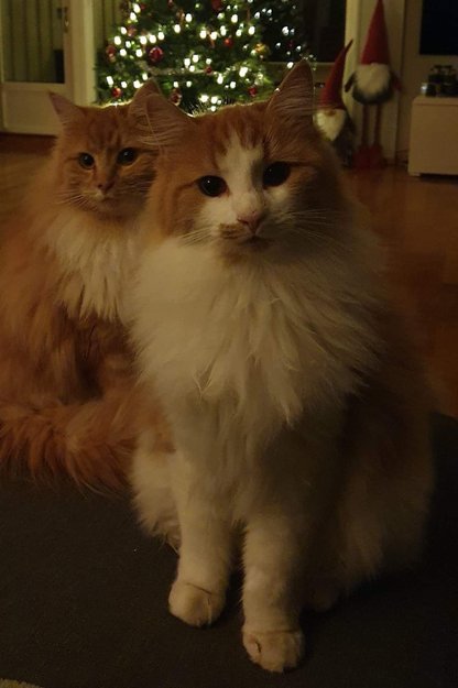 Hvit og rød pusejente med hvitt ansikt og en rød flekk på høyre kinn. Kosete og kontaktsøkende pus.
