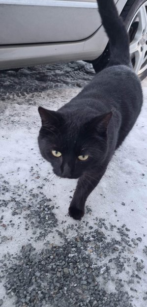 Svart hannkatt. Prater/mjauer mye. Veldig kjelen. Blank i pelsen. Passe tykk.