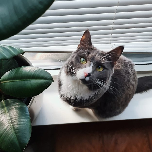 Mørkegrå med hvit på mage og bryst, hvite poter, grå hale og rygg, grønne øyne og hvit på nesa med en sort flekk på halve nesa