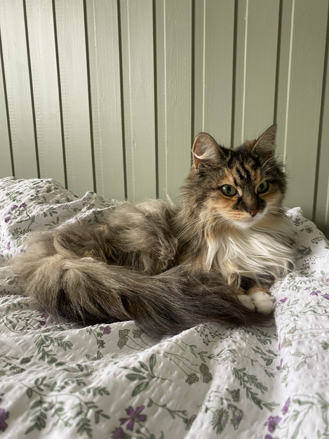 Langhåret, hvit pels på brystet og veldig langhåret hale.