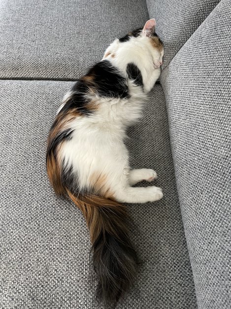 Veldig lang og stor hale. Ekstremt kosete.