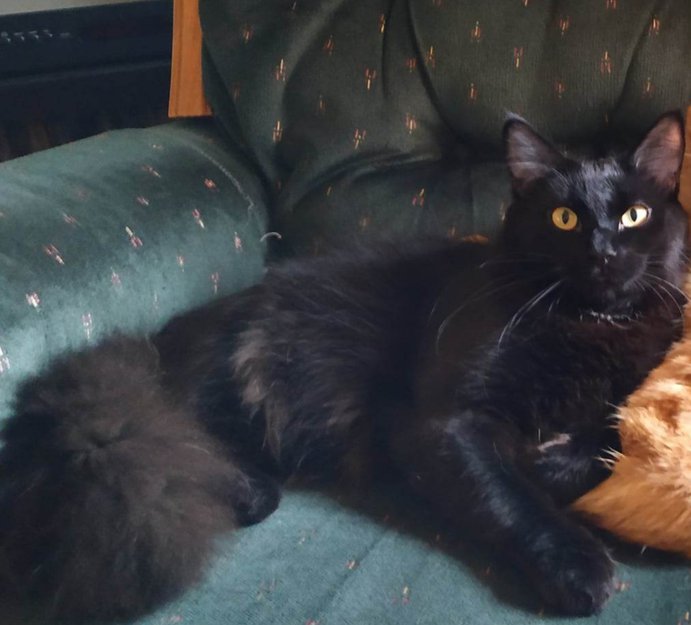 Helt svart, med en liten hvit stripe på kragen. Store brune øyne. Blanding av huskatt og skogskatt. 11 måneder gammel.