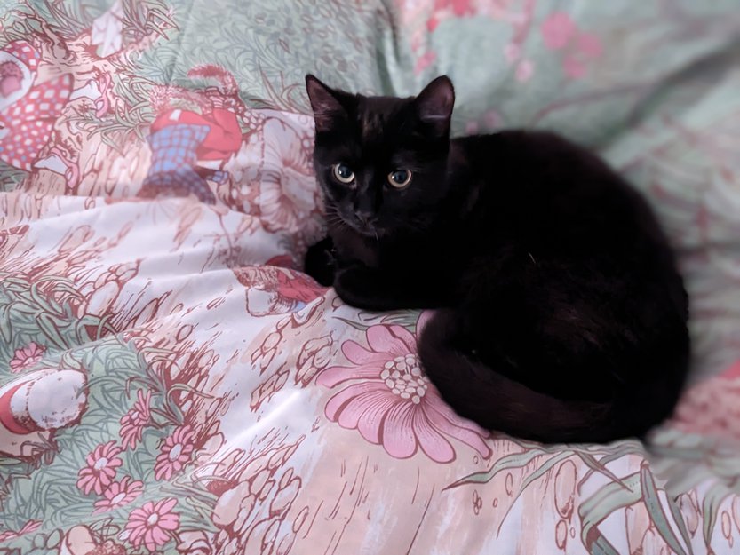 Liten, tynn katt med hel svart pels. Pelsen er også myk. Ett par hvite hår i pelsen.