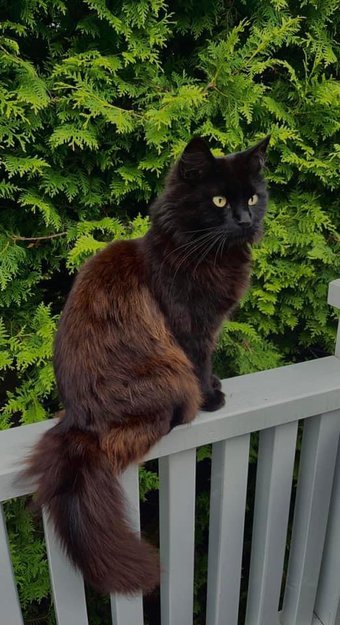 Han er rødbrun i sola, kan se svart ut ellers. Lett gjenkjennelig med høylytte lange mjau og en utrolig kontaktsøkende personlighet.
