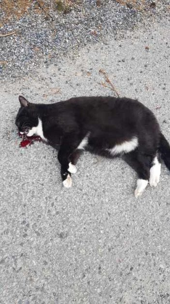 Svart og hvit katt funnet død klokken ca 16.00 fredag 28.04. Mulig påkjørt