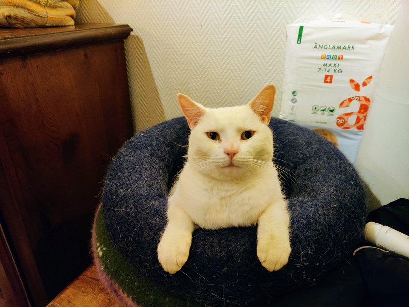 Maja er helt hvit. Ca 4 år gammel. Hun er ganske liten og tynn. Hun er litt sjenert, spesielt for de hun ikke kjenner.