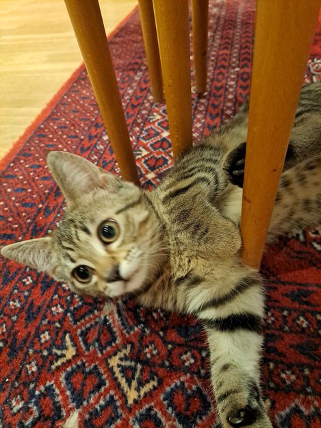 Skipskatt, brun og svart prikkete/stripete. Liten og nett jentepus. Tillitsfull og lyder navnet Milli.
