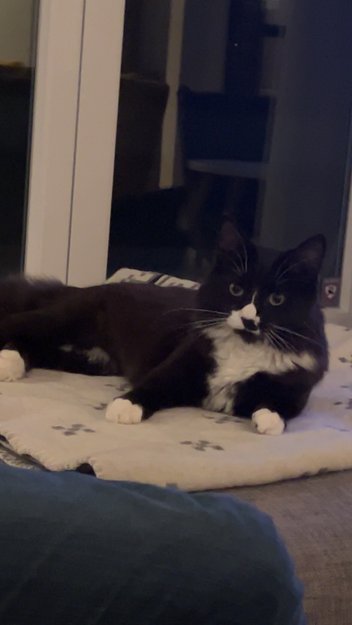 Sort pels med litt brunskjær. Stor og buskete sort hale. Hvite poter og hvit på halsen/snuten. Svart prikk på nesa. Tatovering i øret som viser at hun er chippet.