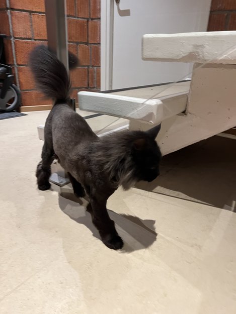 Katten er kliippet hvor den har mye pels rundt potene, ansiktet og halen, elrs ganske lite pels som er trimmet.
