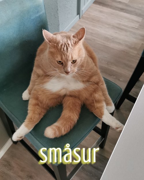 Kastrert hannkatt, ca 7 år. Oransjebeige tigerstripet. Har grønn tatovering id i øret. Har et kutt i et øre. Litt lubben/kraftig.