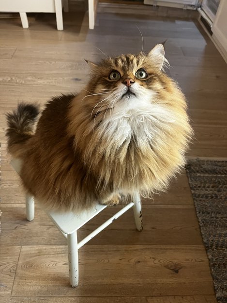 Stor, kompakt og kraftig hunnkatt med stor «løvemanke». Litt bare flekker på sidene og pistrete hale etter røyting. Svært sosial og tillitsfull.