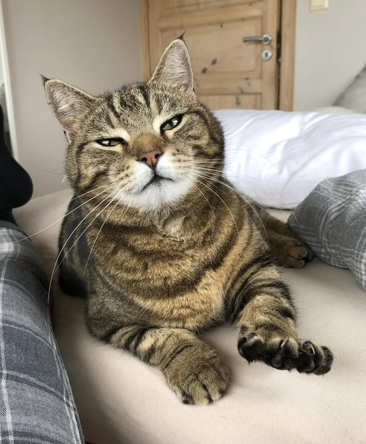 Han har små sorte dusker på øretippene, pluss en liten rift i høyre øre fra et tidligere sammenstøt med nabokatten. Han er litt liten og tettbygd til hannkatt å være.