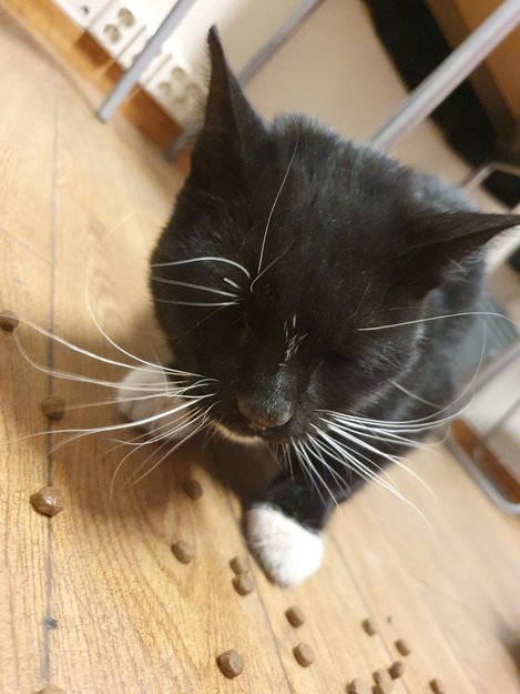 En sort og hvit pus ble plukket opp av en forbipasserende utenfor Meny i Askim som så kom bort til dyrebutikken jeg jobber i og spurte om hjelp.