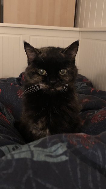 Hun er en ganske karakteristisk katt: Litt gammel, tynn og rar, og mangler værhår på høyre side. Men hun er veldig kosete og snill. Hun hører veldig dårlig, så å rope vil nok ikke fungere. Vær så snill og ta kontakt hvis dere finner henne ❤️