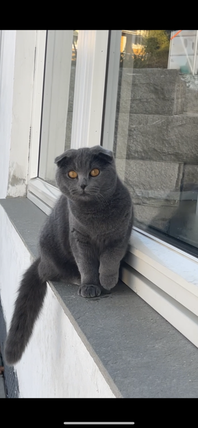 Nala er en ensfarget grå hunnkatt på 11 mnd. Oransje øyne.