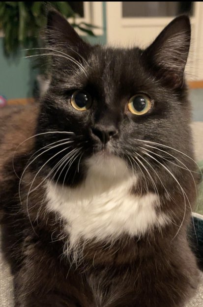 Svart og hvit hunnkatt. Hvite poter. Har også en karakteristisk liten hvit flekk på ryggen, samt svarte værhår på det ene «øyenbrynet». Veldig pratsom, men er skeptisk overfor fremmede. Ikke funnet etter flere søk i nærområdet. Har chip. Sterilisert.