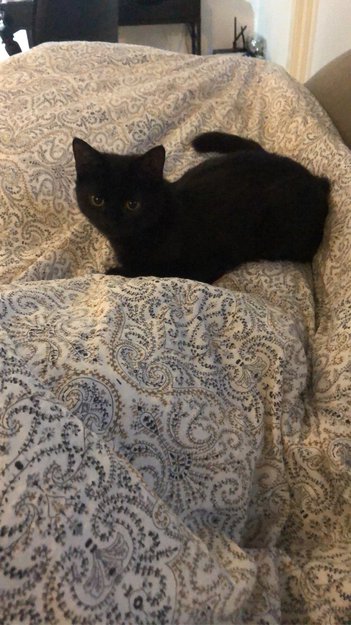 helsvart. har stripe mønster i sola. ganske forsiktig og usikker rundt nye folk men helt ufarlig blir praktisk talt lam når du plukker henne opp. veldig pratsom lager lyder til nesten alt. om det er å hoppe eller å løpe. svarer når du sier navnet hennes (som regel kanskje ikke hvis hun er stresset) ID merka og tatovert i øret