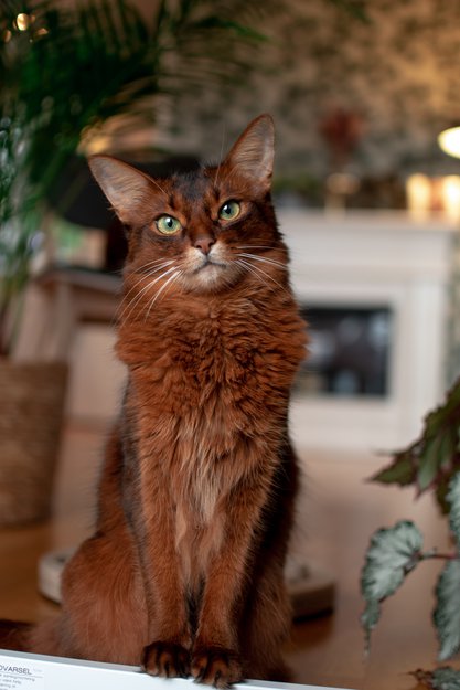 Han er en viltfarget Somalikatt, semilanghåret, lang hale, store ører, gulaktige ører.