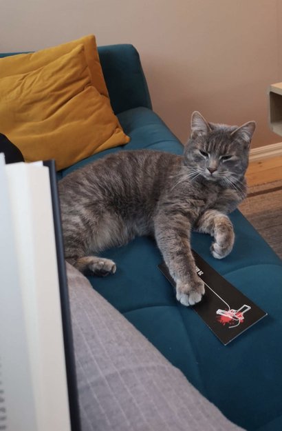 Middels størrelse, ikke fullvokst enda. Veldig nysgjerring og utforskende, liker å være ute. Kan være litt småskvetten. Liker ikke hunder. Veldig glad i kos, nærhet og ligge på fanget, også med andre mennesker enn meg.
