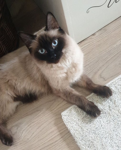 Den er beige med mørke ører og hale. Blå øyne. Mørk flekk under magen. Veldig kosete og tillitsfull.