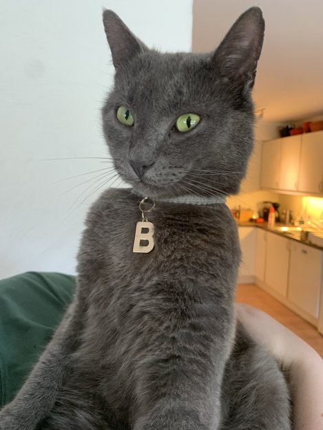 Helt grå og grønne øyne, silke myk pels. Kan være litt sky