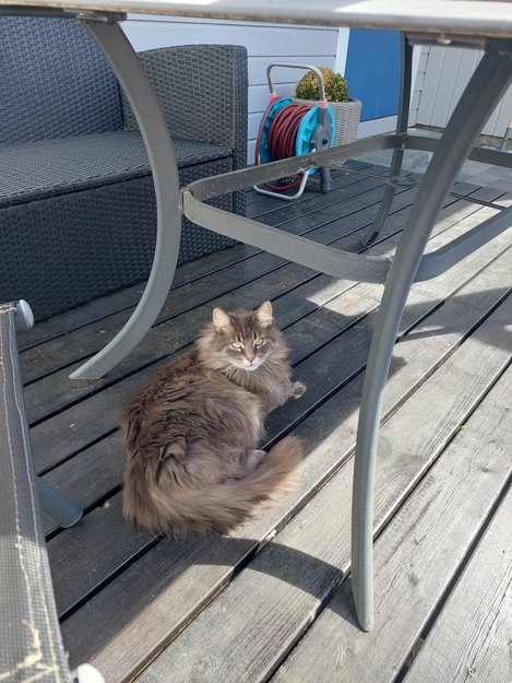 Langhåret katt med brungrå pels og litt hvitt rundt munnen og hodet . Lite hode ifht kroppen . Litt skvetten men nysgjerrig og snill 😀