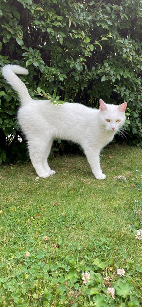 Kosmo er helt hvit, har tatovering i øret og er chip'et. Han er en ganske sky type.