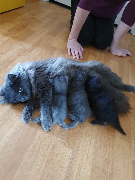 Grå langhåret hunkatt har holdt til ved biri sentrum siden februar. Fikk 4 unger den 19 april.