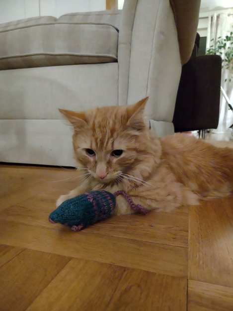 Han er noe frisert pga klumper i pelsen men halen er urørt og langhåret. Han kan være litt skeptisk men liker å "prate" når man først får kontakt.