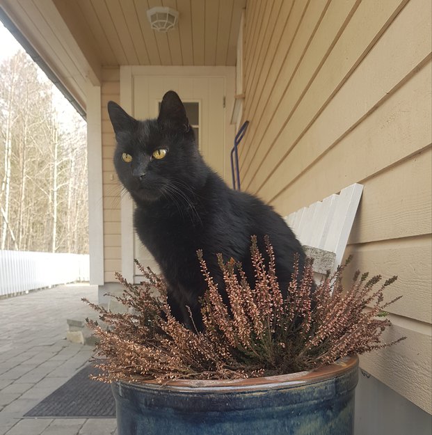 Helt svart, gule øyne, og har på seg et turkis/blått halsbånd med anheng med adresse og tlf nummer i.