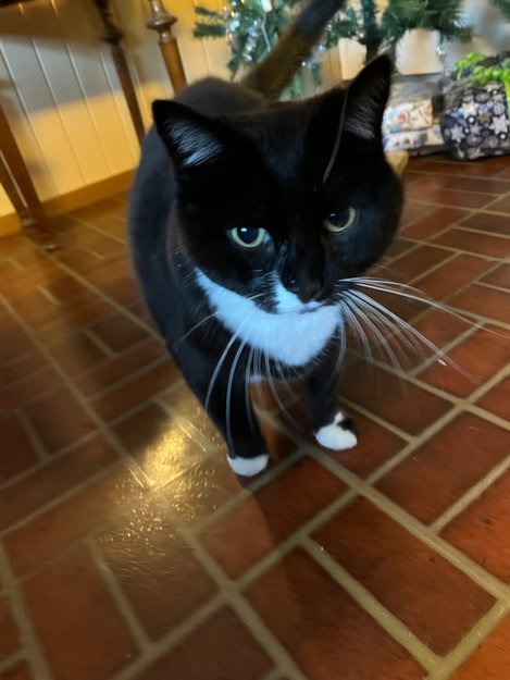 Hvite labber, snute og bryst. Kraftig katt, veldig tung. Mye underpels. Snakker lite, er litt sky.