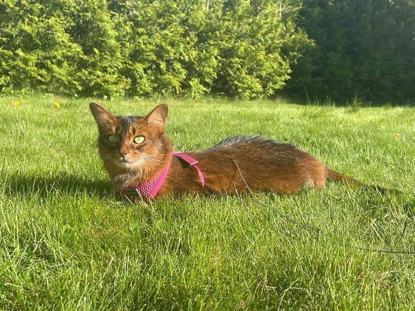 Viltfarget Somali sterilisert hunnkatt. Hvit under haken og kan ligne på svarte striper i pelsen, fra rygg og utover halen. Fluffy krage og hale. Brun, litt rødlig katt. Svarte tegninger i ansiktet.