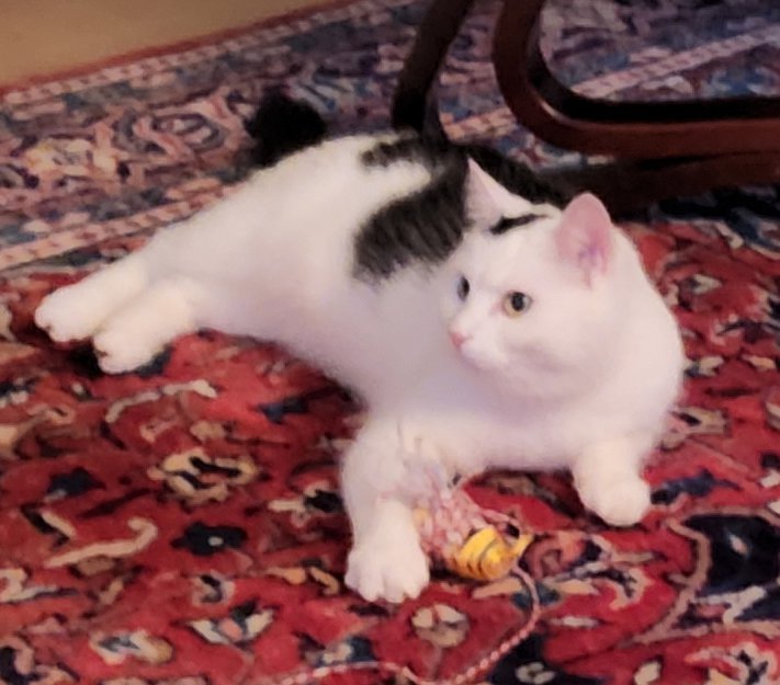 Hunnkatt, slank og middels stor. Hvit foran og under, svart på rygg og hale og en flekk på hodet.