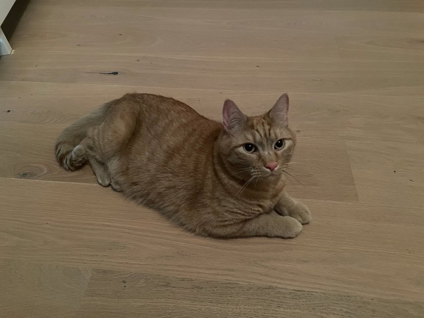 Rødspraglet katt dukket opp utenfor leilighet på Tjuvholmen nå ikveld.