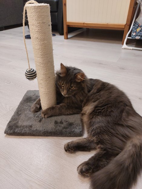 Han er grå langhåret. Haken er hvit. Mage grå med hvit. Veldig leken, mild, tillitsfull. Liker å sove i bokser og fange mus. Blir venn med hunden vår.