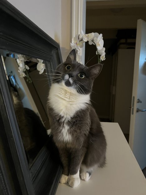 Har en melke bart, hvite poter, hvit bryst og en hvit flekk på venstre bein.