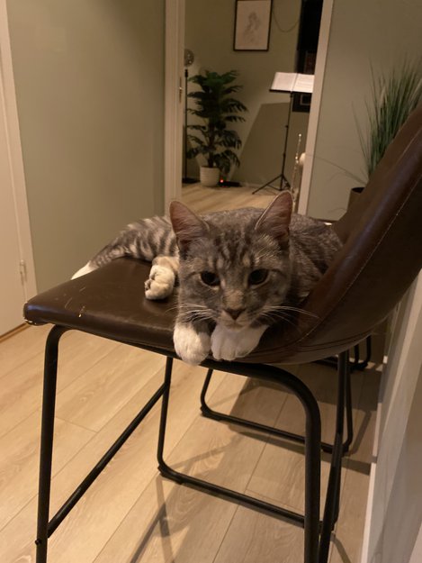 Fersken farget under halsen og rundt munnen. Kosete, men tar ikke kontakt med andre. Glad i mat.