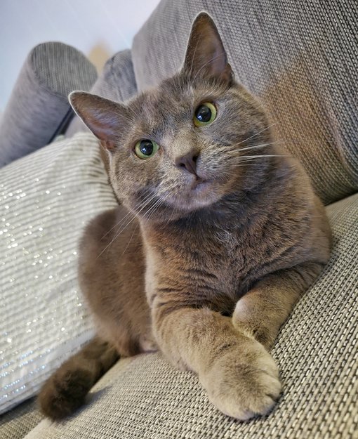 Hun er korthåret grå litt lubben voksen sterilisert pus. Hun har rosa reflekshalsbånd med navn og kontakt tlf.