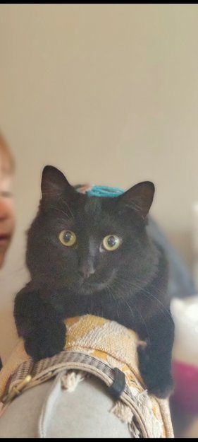 Den har ca fem hvite hår under halsen, skinner litt i brunt i sola. Liten ca 2 år. Lys mjauing, forsiktig men kosete