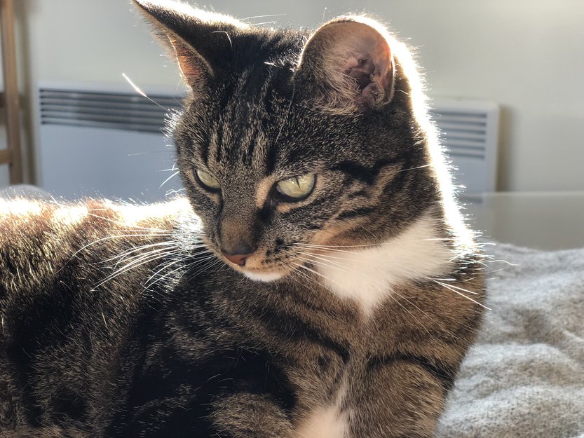 Mille er en liten huskatt på bare 2,5 kg. Nesten svart på ryggen med hvitt på halsen og magen. Litt beige underpels.