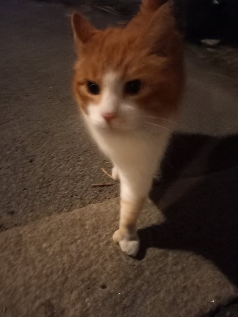 Kl 02.30 natt til 18.mai er jeg i politiparken for å lete etter min egen katt (Hugo, har vært savnet siden 9.mai, egen annonse under savnet) Da møter jeg en oransje og hvit katt, den er kontaktsøkende og ville hilse. Da jeg klappet den var pelsen veldig klumpete og fett. Mange tover.