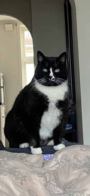 Hun er litt stor i størrelsen og har mest svart pels. Men er hvit i halsen, potene og nesen.