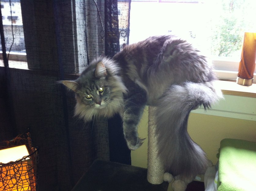 Hun er lysgrå nedover halsen med en lys krans med hår rund nakke/hals. Er grå spettet over kroppen og har en lang fyldig hale. Hun er en stor/lang katt og ser ut som en gaupe med hårtipper på toppen av ørene.
