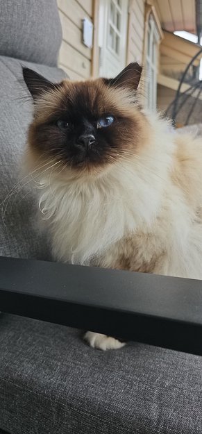 Er hvit med sort ansikt, sort hale og sorte labber. "Skravler" og lyder navnet sitt.