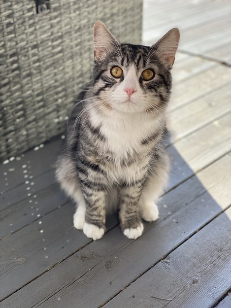 Grå, Hvit og Svart spraglete/tigerstripet katt.