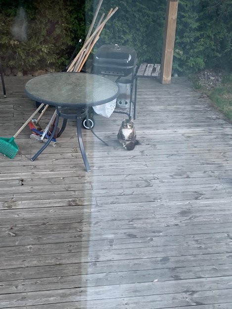 Katten har besøkt hagen min hver dag siden midten av april. Den pleier å komme på alle tider av døgnet. Den har ingen halsbånd. Katten er veldig skvetten. Jeg har matet den i noen uker siden den ikke får mat noen andre steder.