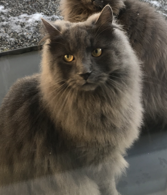 Han er en stor katt på nesten 7 kg. Han er langhåret, grå, med litt lysere dusker bak ørene, og noen hvite hår på brystet. Han er litt sky, men nysgjerrig og pratsom. Veldig kosete hvis han er trygg.
