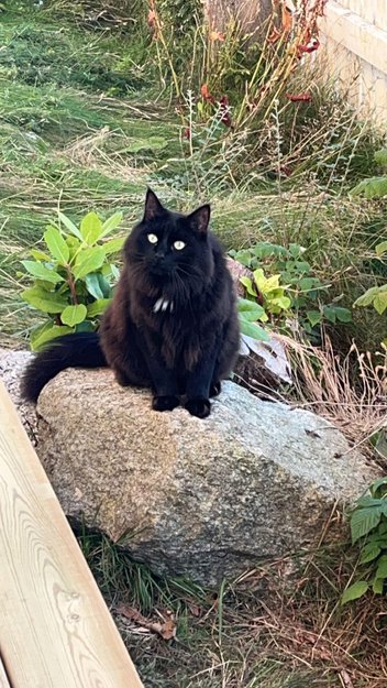 Langhåret svart katt med hvit flekk på brystet. Veldig pratesyk men kan være skeptisk når han er ute